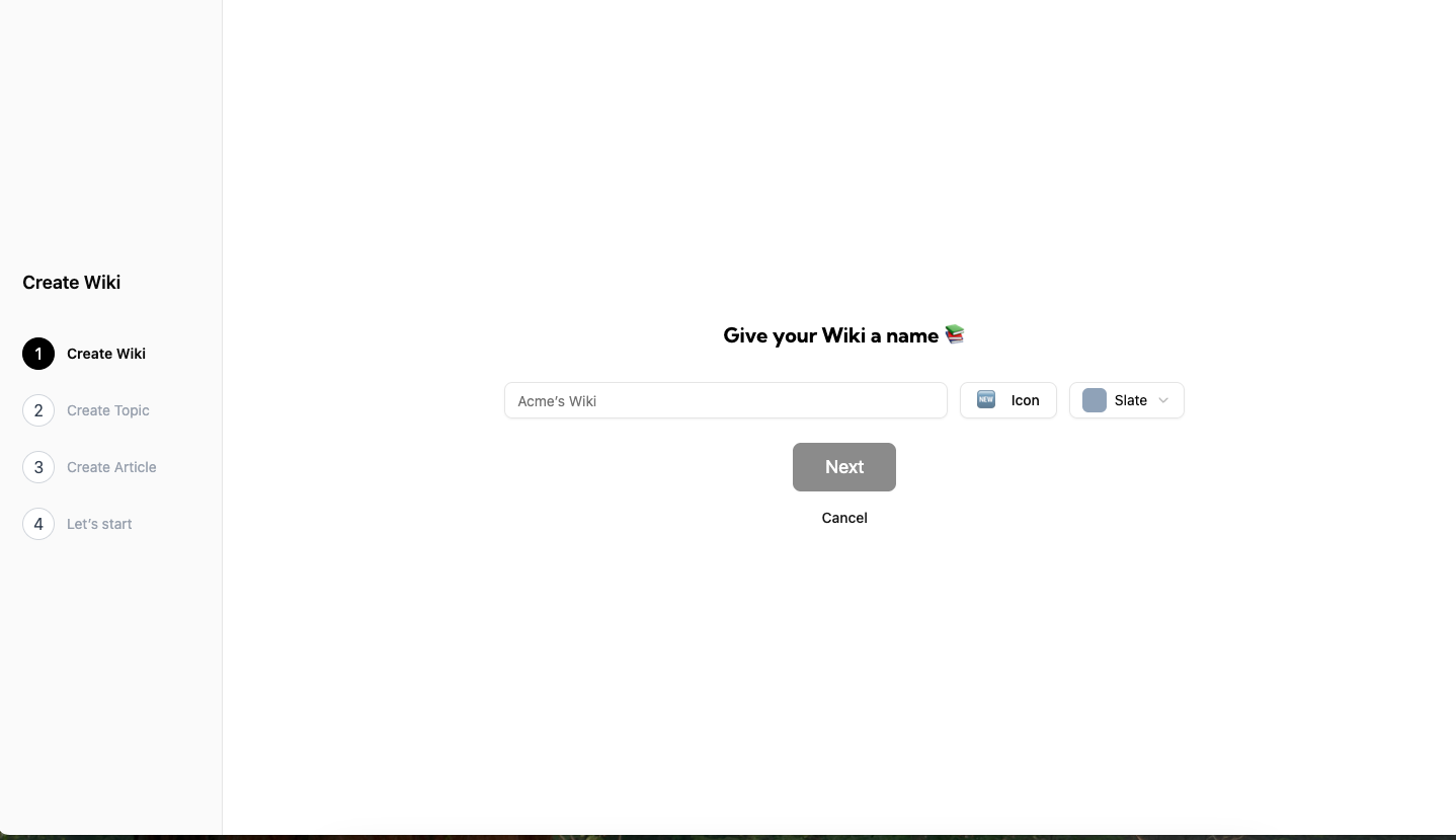 Step 3: Give your Wiki a name. You can also add an icon and a main color. Then click on "Next".