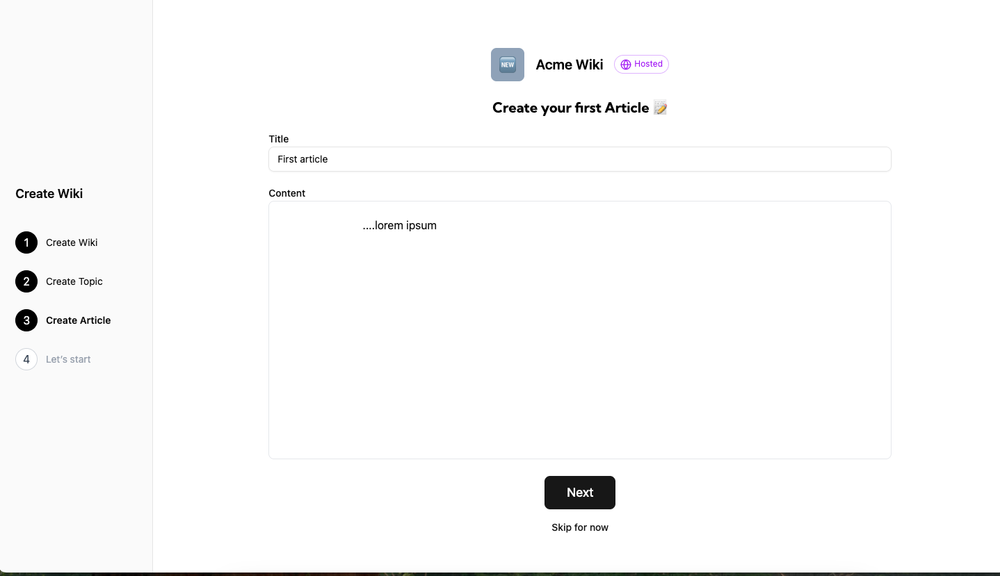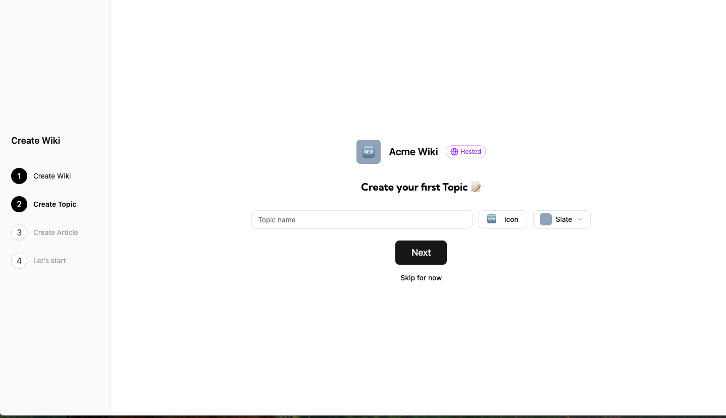 Create your first topic. You can also choose an icon and a main color for the topic. Click on "Next".